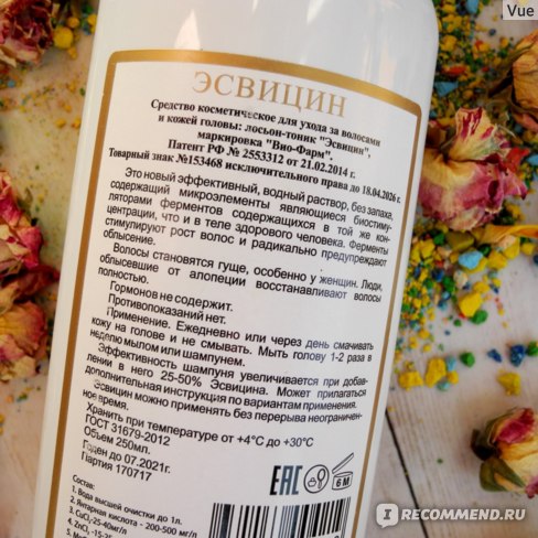 Косметическое средство для стимулирования роста волос на голове и бальзам для всестороннего оздоровления людей. «ЭСВИЦИН» это водный раствор минералов и микроэлементов — биостимуляторов ферментов таких как: кальций, железо, магний, калий, фосфор, кремний, селен, медь, цинк, марганец, кобальт, хром, а также янтарная кислота и витамин С в концентрациях близких к их содержанию в теле человека.