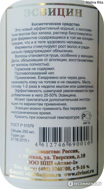 Больные алопецией полностью восстанавливают волосы в течение 6-12 месяцев. Для нормального роста волос необходимо питание с достаточным количеством белка и низким содержанием жиров и углеводов. - Насморк, грипп. Кроме приема внутрь, следует несколько раз в день промывать «Эсвицином» носоглотку используя маленькую спринцовку. При этом может пройти кашель и даже хронический бронхит.